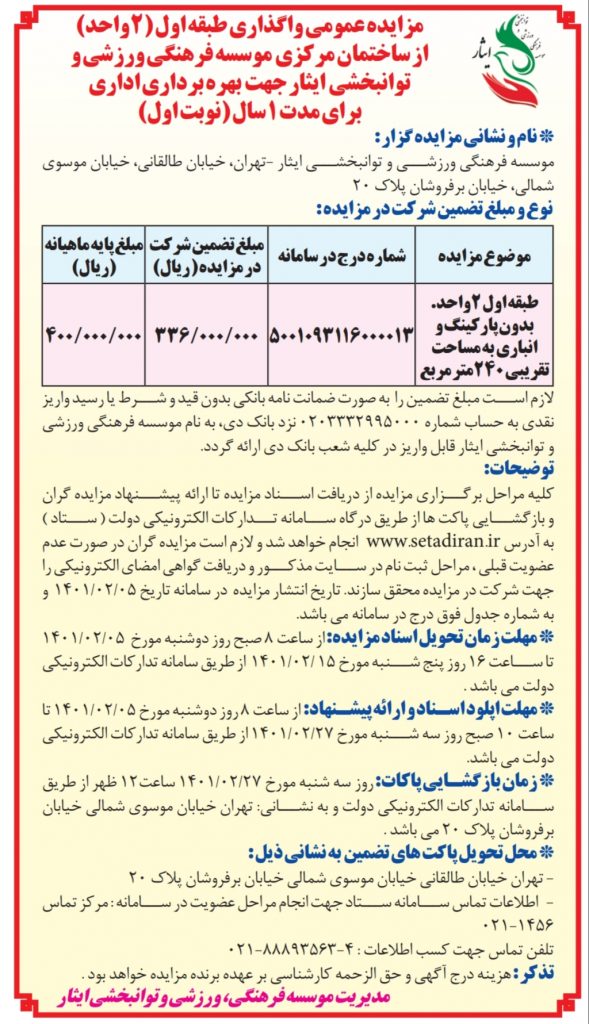 مزایدهی دو واحد ساختمان مرکزی ایثار