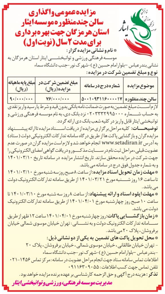 مزایدهی سالن چندمنظورهی ایثار هرمزگان