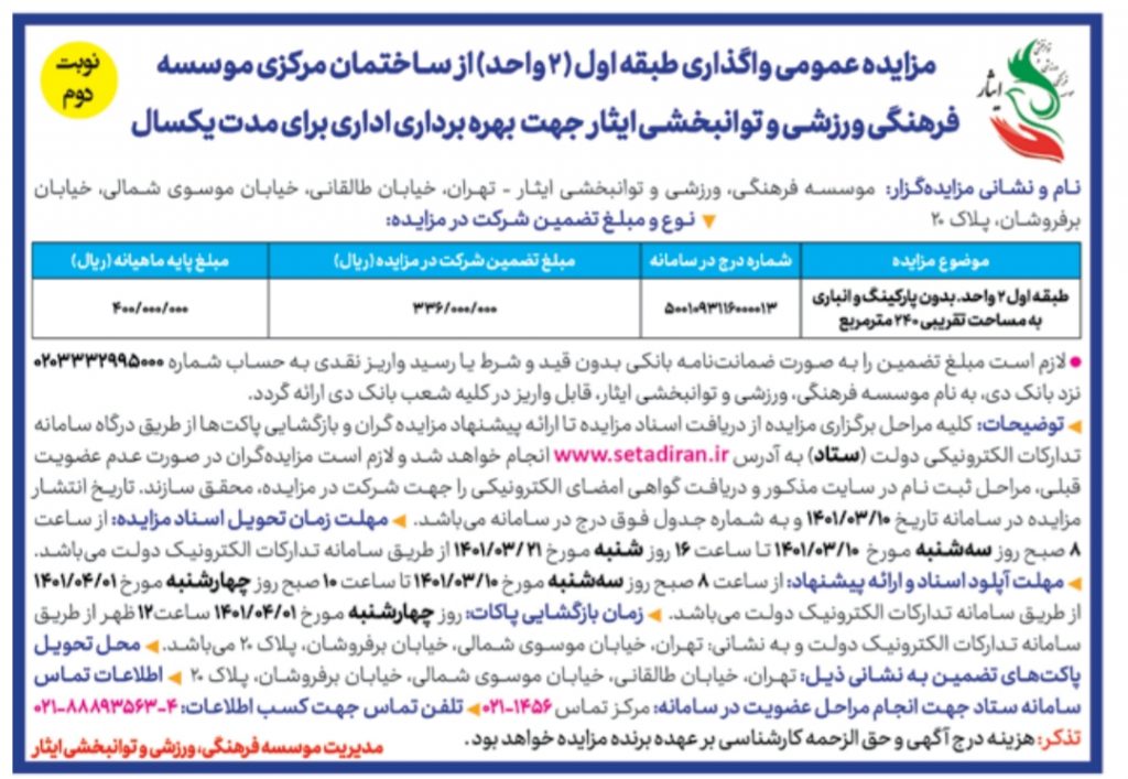 مزایدهی طبقه اول ساختمان مرکزی ایثار