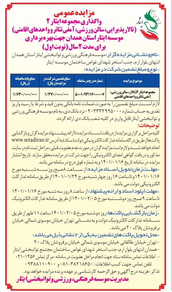 آگهی مزایده عمومی واگذاری بهره برداری از مجموعه ورزشی(استخر، سالن رزمی، سالن تیراندازی) موسسه فرهنگی، ورزشی و توانبخشی ایثار استان اصفهان
