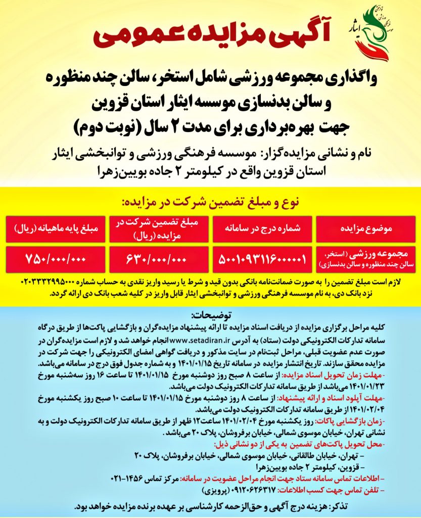 مزایدهی مراکز ورزشی ایثار در قزوین